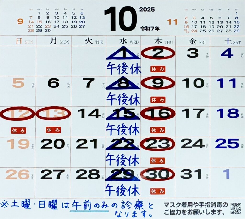 10月外来予定日 10月4日(土)・5日(日)・11日(土)・15日(水)・25日(土)・27日(月)AM → 院長のみの診察となります(1診体制)10月1日(水)・8日(水)・10日(金)AM・29日(水) →小森医師のみの診察となります(1診体制)10月18日(土)・19日(日)・22日(水)・26日(日) →院長+小森医師の2診体制で診療いたしますそのほかの平日は通常通りの勤務体制です。予定が月毎に変わりご迷惑をおかけしますが、よろしくお願いします。 前後の記事へのリンク << 9月外来予定日インフルエンザワクチンについて >>