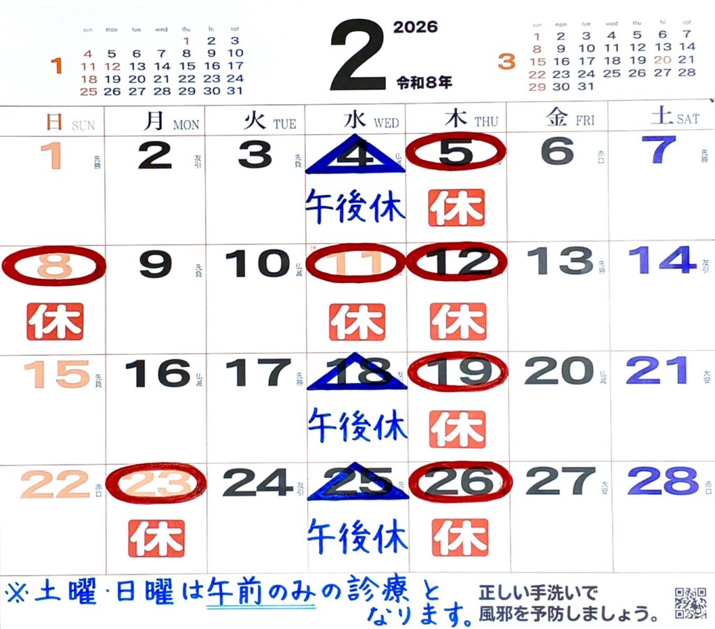 2月外来予定日 2月4日(水)・6日AM(金)・25(水) → 院長のみの診察となります(1診体制)2月18日(水)・22日(日) →小森医師のみの診察となります(1診体制)上記以外の水曜・土日は院長・小森医師の2診体制で診療いたします。他、平日は通常通りの勤務体制です。 前後の記事へのリンク << 新年のご挨拶・1月外来予定日