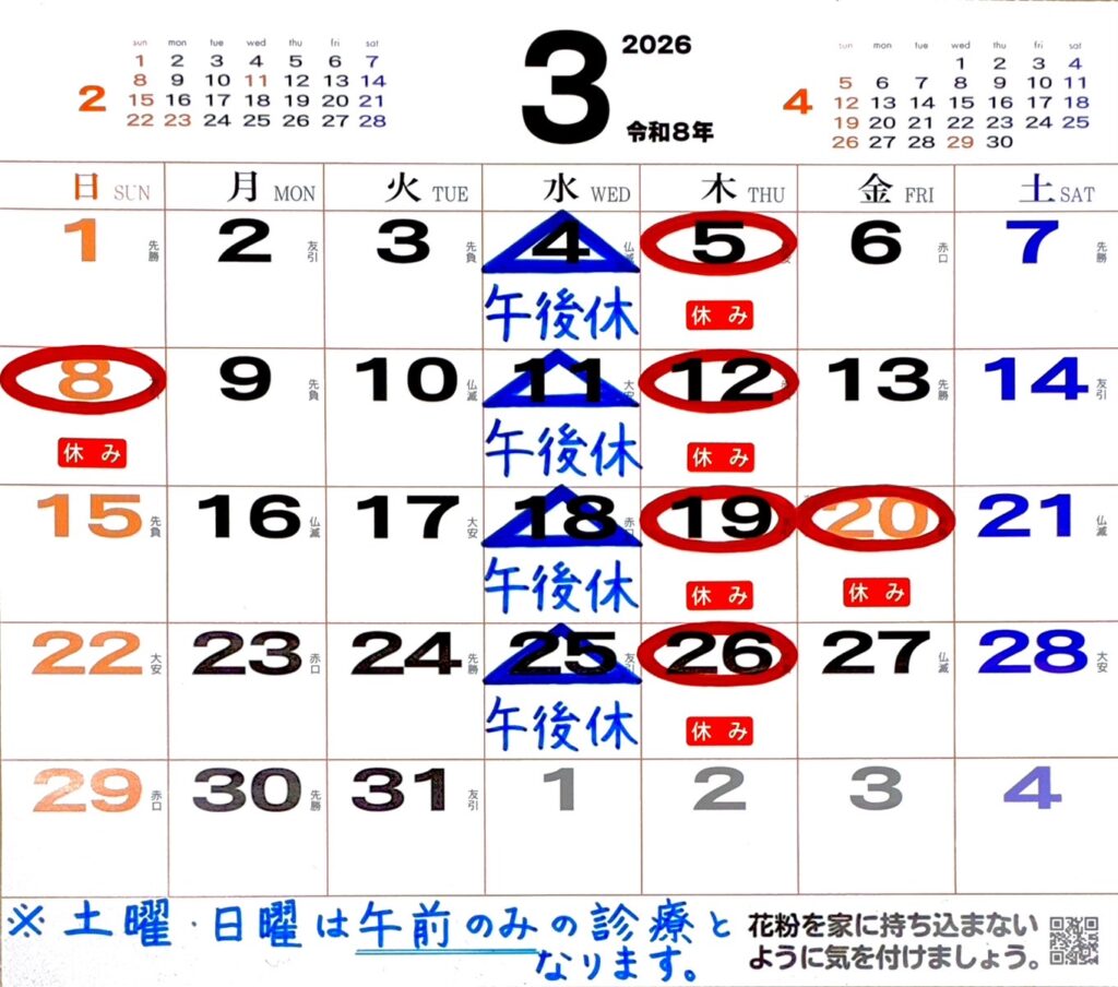 3月外来予定日 3月9日(月)AM 10時〜11時半・21日(土) → 院長のみの診察となります(1診体制)3月18日(水)・22日(日) →小森医師のみの診察となります(1診体制)上記以外の水曜・土日は院長・小森医師の2診体制で診療いたします。他、平日は通常通りの勤務体制です。 前後の記事へのリンク << 2月外来予定日4月外来予定日・GW中の休診日 >>